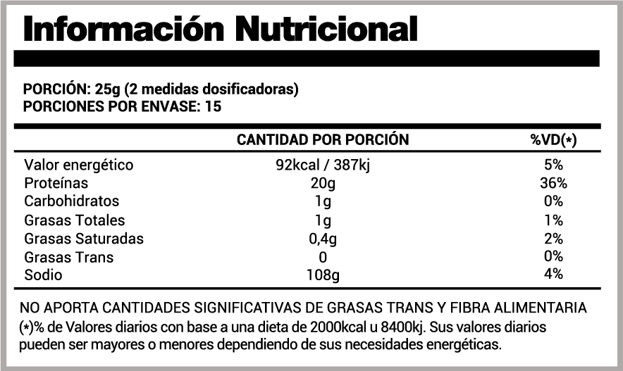 Cada porción aporta 21 g de proteína, ideal para contribuir al aumento y recuperación de la masa muscular, así como para complementar el aporte diario de proteínas.